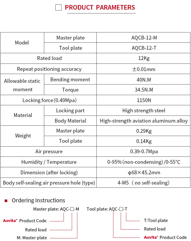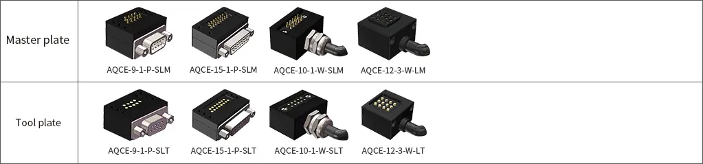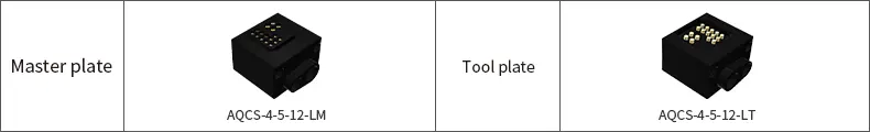 The quick-change function module provides access to media such as electricity, communications, compressed air, and hydraulic pressure for the robot execution tool, enabling simultaneous connection of supporting media when the main part of the quick-change is quickly connected. The following are the adaptation modules for AQC-12 robot tool quick change products: