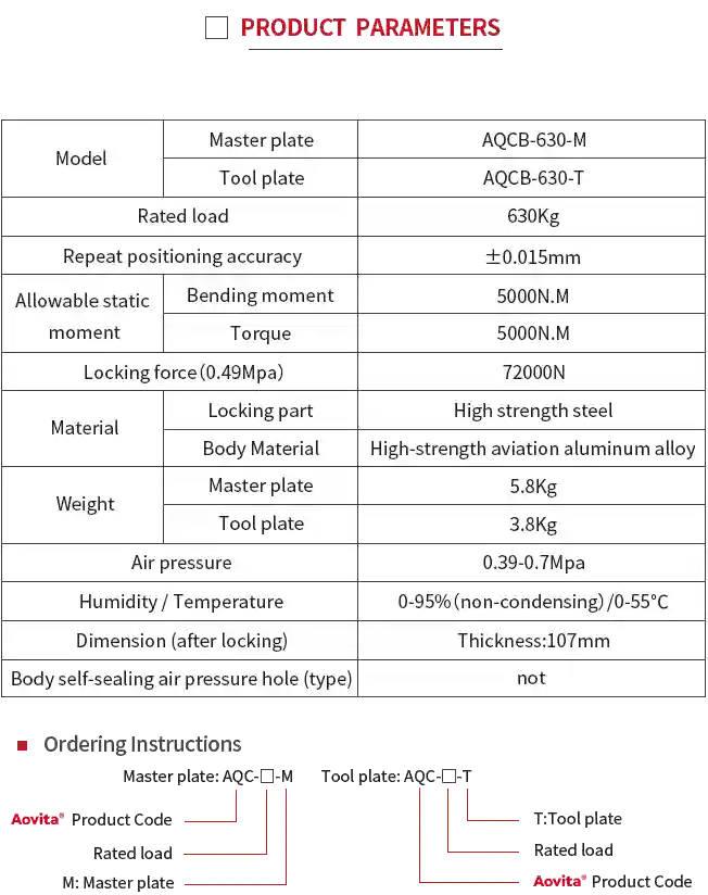 The quick-change function module provides access to media such as electricity, communications, compressed air, and hydraulic pressure for the robot execution tool, enabling simultaneous connection of supporting media when the main part of the quick-change is quickly connected. The following are the adaptation modules for AQCB-630 robot tool quick change products: