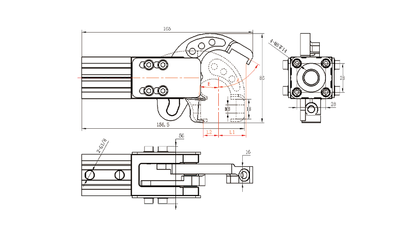 应用场景:垂直式夹钳,适用于板料90度翻边情况钳臂打开后向下运动,需预留适量避让空间