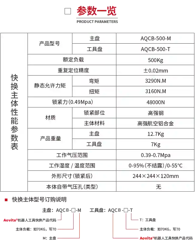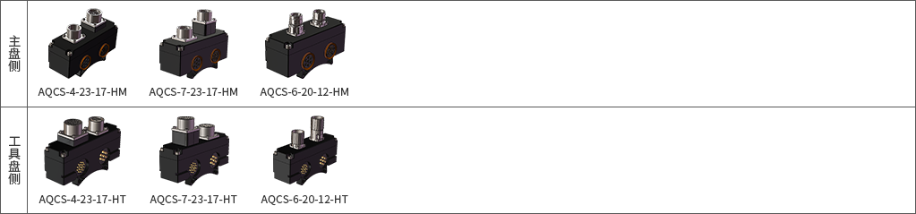快换功能模块为机器人执行工具提供电力、通信、压缩空气、液压等介质的通路,实现在快换主体部分进行快速连接时,配套的电力、通信、压缩空气、液压同步连接。以下为AQC-500型机器人工具快换产品适配模块: