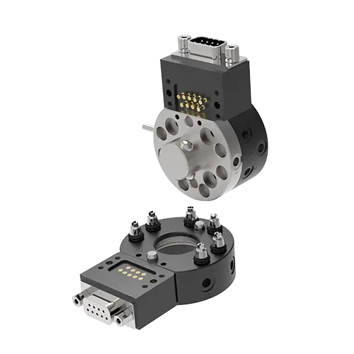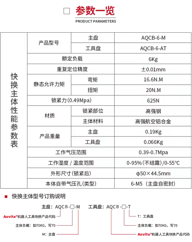 快换功能模块为机器人执行工具提供电力、通信、压缩空气、液压等介质的通路,实现在快换主体部分进行快速连接时,配套的电力、通信、压缩空气、液压同步连接。以下为AQC-6型机器人工具快换产品适配模块: